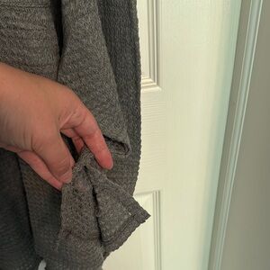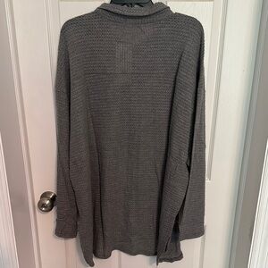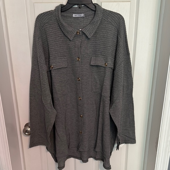 Stylish gray button down shirt with a textured design. Perfect for casual wear. Functional button pockets on the top. Fabric is very soft. Fabric is 64% polyester, 34% rayon and 2% spandex.