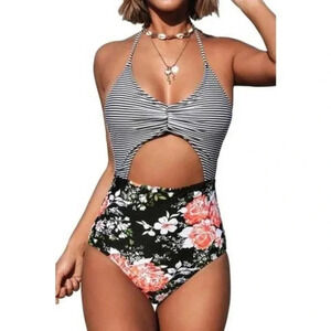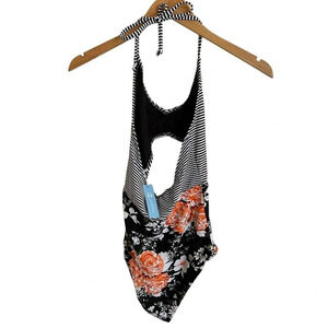NWT CupShe size Medium Striped Cut Out One Piece Swimsuit Halter Tie Floral New