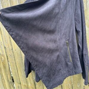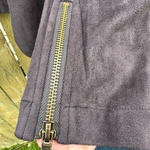The beautifully draped lapels of this luxe faux suede jacket are perfectly balanced by the slightly cropped silhouette, making this edgy-chic piece perfect for layering over your favorite looks. Gold zippers add a flash of shine.