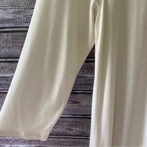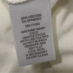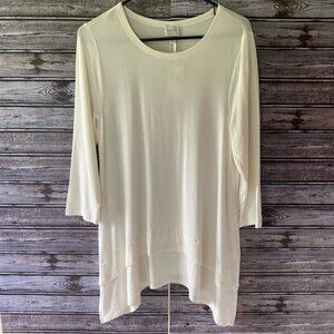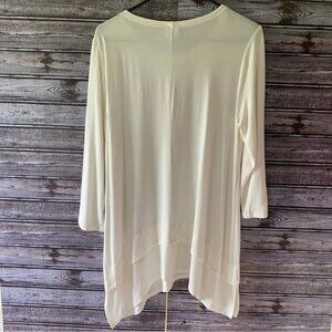 This Women's Top by Cupio is a Size M and is made of 95% Viscose and 5% Spandex. It is an off-white cream color with a layered asymmetrical bottom as shown. NWT. Excellent Condition!
