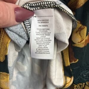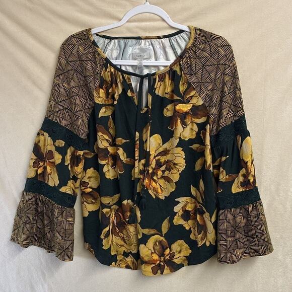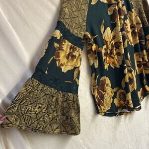 Cupio floral blouse with a deep green base and vibrant yellow and brown floral print. Features contrasting geometric pattern on the upper sleeves and bell sleeves. Delicate lace trim accents the sleeves, adding a touch of bohemian charm. Made from a comfortable and soft blend of 95% viscose and 5% spandex. Perfect for adding a pop of color and style to any casual or semi-dressy outfit. Excellent new with tags condition.