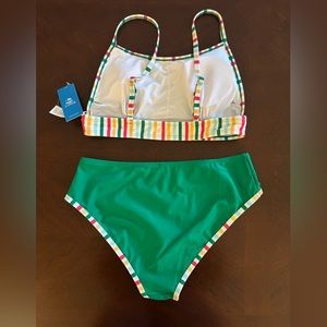 This vibrant green swim set features colorful stripes for a fun beach look. Perfect for summer adventures.