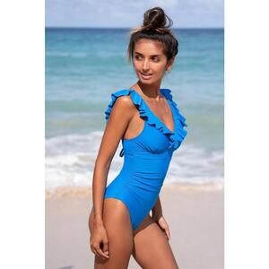 NWT Cupshe Blue Lurex Ruffled Tummy Control One Piece Swimsuit - Size Medium
