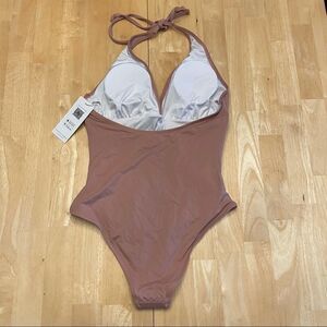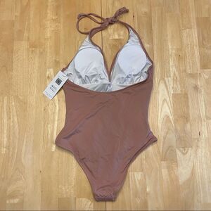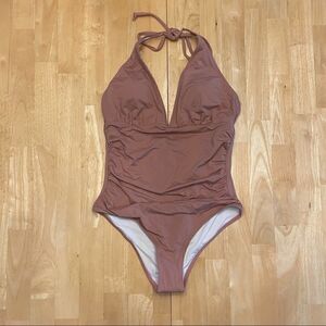 This cute shirred one piece swimsuit is brand new with tags attached. It is dusty pink. The front is ruched and it has a deep halter v-neck front. The chest has removable padding.