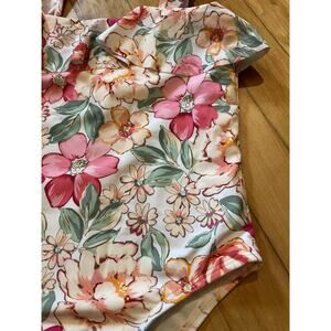 Size 6. White with tropical floral. Ruffled neckline and straps. Nylon/spandex blend.
