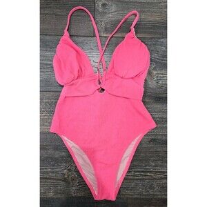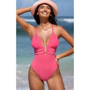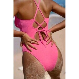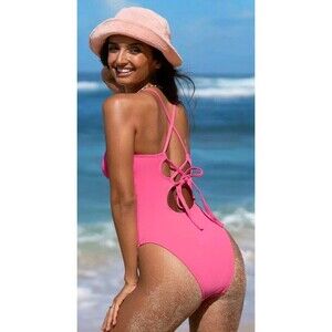 NWT Cupshe One Piece Swimsuit U Ring Strappy Cheeky Pink Lace Up Back Plunging L