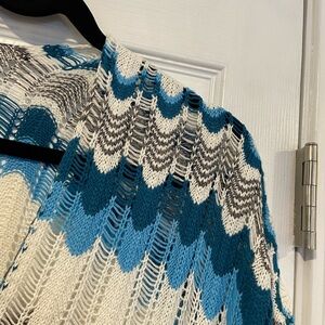 Pullover side tie tassel v neck open knit chevron blue white swimsuit coverup