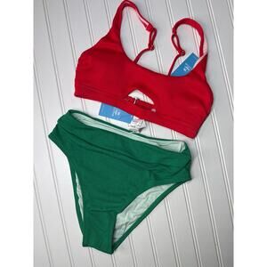Bundle of 2 SETS of Cupshes Swimsuit Red Cut out Bralette with Green High Waist Bottom and Blue Triangle with lime green Mid Waist Bottom
