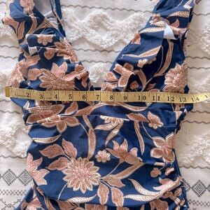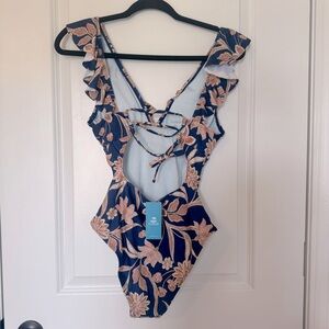 Dive into style with this NWT Cupshe elegant blue and tan floral swimsuit. Featuring a flattering ruffle design, it's perfect for a chic beach look. Lace up back with tie to be adjustable. Classic bottom and tummy control.