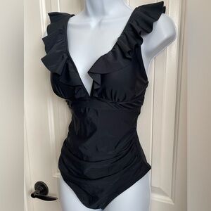 NWT Cupshe Women's Solid Color Ruffled Laceup V Neck Monokini in Black, XXL