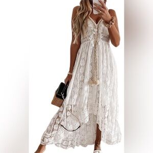 V neck, adjustable straps, decorative braided tassels (white, cream, gold) with poms on the end in the front, partially lined