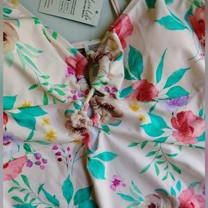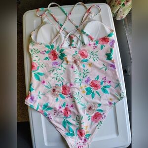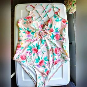 NWT Cupshe pink floral one piece swimsuit, relaxed summer, beach, cruise, full stretch size XL, adjustable straps, crisscross back straps, lined, body-hugging style, covered back, front 3-way neckline detail for figure-flattering, nylon, spandex, polyester, pullover, look carefully at the measurements, keep in mind that it is not the final measurement since it stretches more, new with tag.