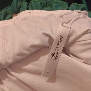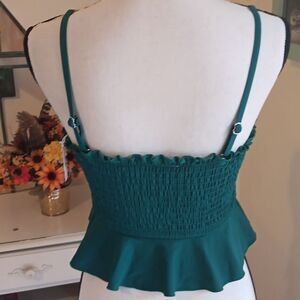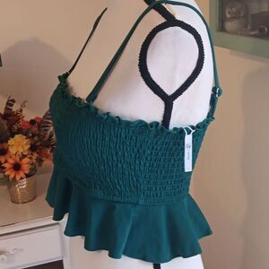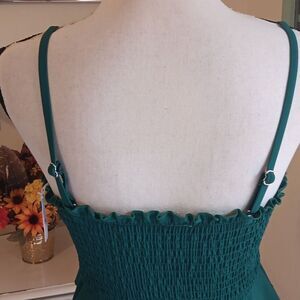 NWT Sweet top. Evergreen color. Shirred elastic at chest. ruffles below. Adjustable straps. Size L measures 26-38 , built-in bra. 17 long from shoulder to hem.