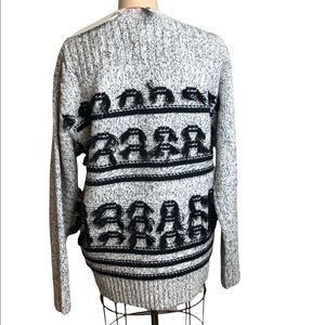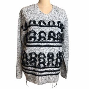 Fabulous! Black/off white color with amazing fringe trim front and back. Crew neck style. Wool/cashmere blend. Size 2 is equal to a size M