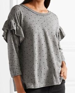 A knit sweatshirt with ruffle detailing on the sleeves. Fit: this style fits true to size. - Boatneck - Long sleeves with ruffles - Slips on over head - Knit construction - Approx. 26" length (size 2) - Made in USAFiber Content54% cotton, 37% polyester, 9% rayonCareMachine wash cold