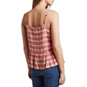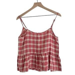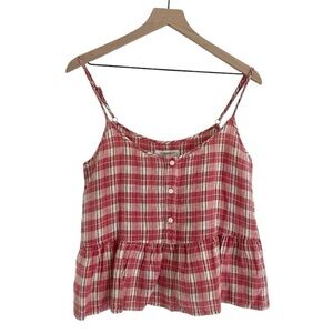 Current Elliott women’s linen blend the workwear peplum top (tank top) in a pink/red plaid color and pattern. Size 0 in current Elliott, which is equivalent to size 2.