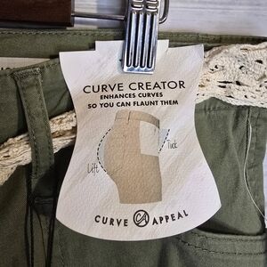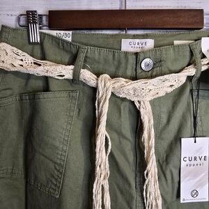 NWT Curve Appeal Womans Size 10/30 Hunter Green High-rise Flare Pants with cream colored belt. Button and zip enclosure with pockets.
