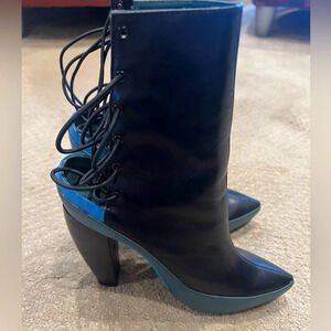 Cynthia Rowley Leather Black Boots with Lace Up Back, with blue and green accents. Size 36.5 (US 6)