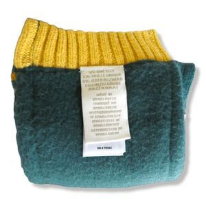 A green knit sweater dress with ribbed bodice, crew neckline, and candy corn & pumpkin fair isle trim