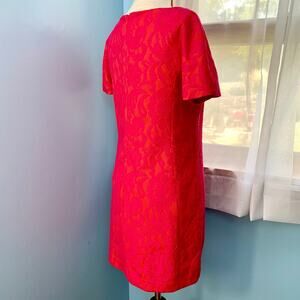 A beautiful short sleeve dress in bright pink lace with an orange/coral lining. Perfect for special occasions, weddings or parties! Boat neck, back zipper, fully lined.