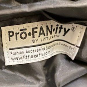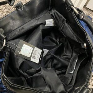 NEW with all TAGS (authentic NFL merchandise) ~ Pro-FAN-ity(by Littleearth) * A GORGEOUS SHADE of rich ROYAL BLUE quilted fabric with BLACK faux LEATHER accents and trim. It measures about 13-1/3" across the flat black base, and about 5-1/2" across. But it measures about 15-1/2" across the wide BLACK band at the top of the tote. 12" from the top of the tote to the bottom, and the double straps are sturdy and have a 7-1/2" drop.