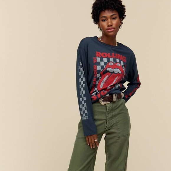Check out the newest Rolling Stones piece of merch. With their classic hot lips logo front and center accented in checkers, the fans can’t go wrong with this one. Headlining their ‘81 American Tour, the tour responsible for filling stadiums and arenas setting multiple ticket and attendee records. Designed with two sleeve hits and all things Stones, this newbie is a no brainer addition to your collection.