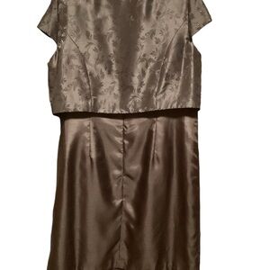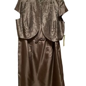 NWT Beautiful 2 piece mother of the bride dress in a gorgeous deep chocolate. By Jessica Howard Evenings. Under dress is sleeveless with back zipper closure, jacket is a bit of a cap sleeve/vest combo with great embroidered floral design with bead accents, no closures. The color is so rich that it’s perfect for formal wear and absolutely able to be worn more than once. Amazing price and makes for a great gift. Waist to front hem is 27”.