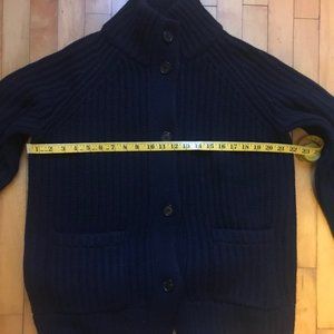 Two side patch pockets, heavyweight knit. Navy. Extra button included.