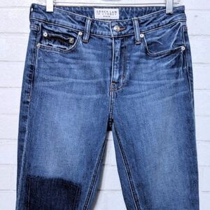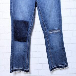 Zip fly with button closure. Five pocket construction. Cropped. Patchwork details. Flared hem.