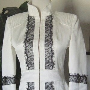 NWT DESIGNER MOTO BLAZER STAND COLLAR OFF WHITE BLACK LACE TRIM SIZE 2 WOMENS