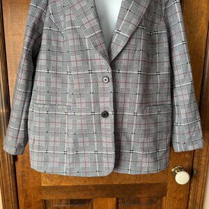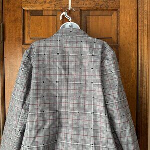 New with Tags; DG2 by Diane Gilman; Jacket; Size 1X; Glenn Plaid; Black. White & Burgundy; Fully Lined; 2 Button Close; Extra Button Attached; Slit Pockets on Front; Double Vent Back; Main: 64% Polyester, 32% Rayon & 4% Spandex; Lining: 95% Polyester & 5% Spandex; Machine Wash & Hang Dry; Armpit to Armpit 25"; Armpit to Hem 18"; Sleeve 18"; Across Shoulders 19"; Length 28"