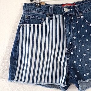 *NWT* DICKIES Stars & Stripes Print 5-Pocket Shorts, size 3/26. Frayed hem. Solid blue in the back. Brand new with tags.