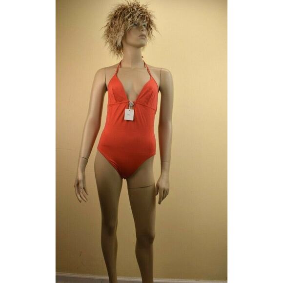 NWT DIOR CORAL NYLON STRETCH PLUNGE SPAGHETTI ONE PIECE SWIMSUIT US 10