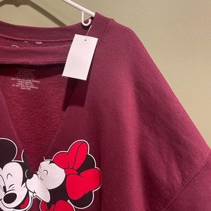 Mickey and Minnie. Perfect condition. No rips, stains, or marks. New with tags. Maroon. V cut out under the neck.