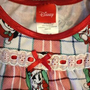 New with tags! It would make a great gift! 100% Polyester. Flame resistant. Plaid pattern with Micky popping out of a wreath. Elastic on the sleeves and ruffle on the bottom. Lace ribbon and bow above the chest. Chest:17" from armpit to armpit. Waist:17.5" from side to side. Length:32" from the armpit down. Smoke-free, pet-free home.