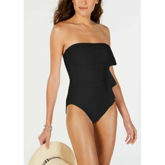 NWT DKNY 12 Black Ruffle Bandeau 1PC Swimsuit Black 97781
