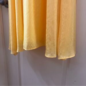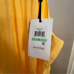 Size 8 butter yellow a-line dress with detailed waist. It also has a light flower detail. This is a beautifully cut dress. Accentuates all the right places. It is not stretchy, but fits a true size 8. Yellow, which is the color of the season!