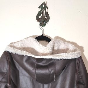 NWT! DKNY Faux Leather Faux Shearling Hooded Brown Long Jacket Small MSRP $400