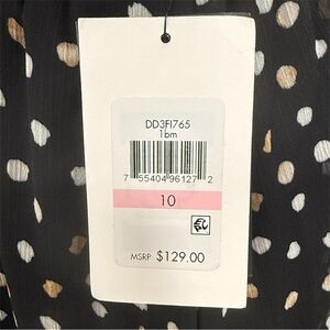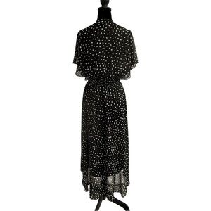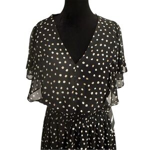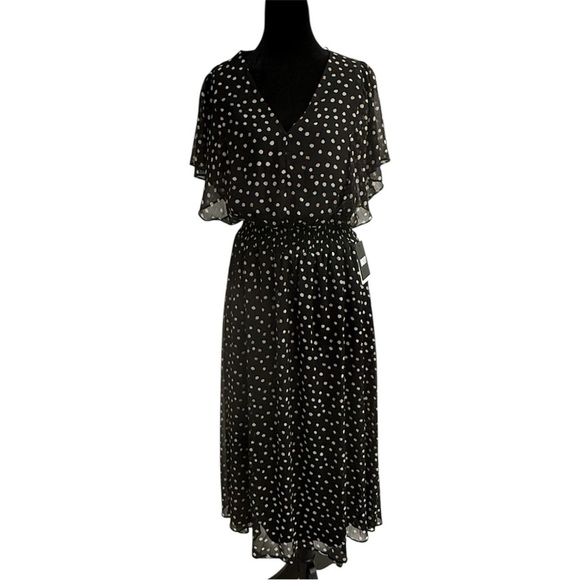 NWT DKNY midi dress. Flutter sleeves. Fit and flare style. High / low style. Elastic waist. Pull on style dress. Fully lined. Black with white and tan polka dots. Size 10. Mint condition.