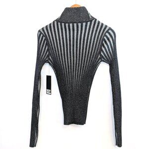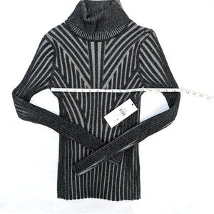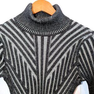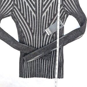This DKNY sweater is a sleek, modern turtleneck featuring an optical gray and charcoal striped pattern arranged in angular, directional lines that create a sculpted illusion. The fitted silhouette and rib-knit texture give it a contemporary, refined edge ideal for both office and casual wear.
