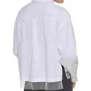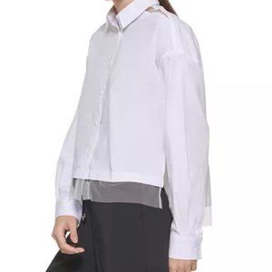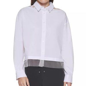 Lightening up classic shirt styling with airy mesh accents and a cute cropped length, this DKNY mixed-media top refreshes a wardrobe.