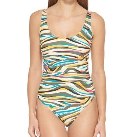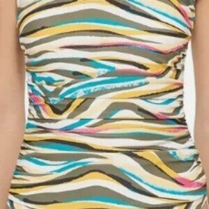 Have some fun in the sun with this beautiful multi color one piece swimsuit from DKNY. Pull-on styling with scoop neckline, over the shoulder straps and removable soft cup padding. Allover print with mesh sides, full bottom coverage and lined. Nylon/Spandex blend, feel free to message with any questions. Thank you for shopping with us and have a great day!