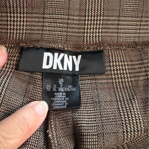 These Dkny dress pants in a rich brown plaid feature a sleek design crafted from a smooth, professional fabric. Perfect for formal occasions, they offer a clean, classic silhouette that complements any sophisticated wardrobe.