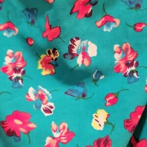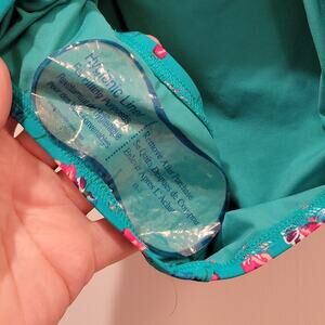 Pretty bright floral on teal, color called Lagoon. Cute ruffle around entire top, detachable neck strap, built in bra.