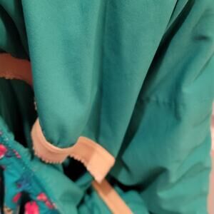 Pretty bright floral on teal, color called Lagoon. Cute ruffle around entire top, detachable neck strap, built in bra.