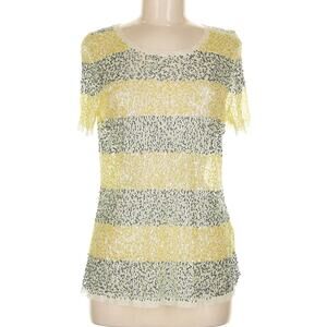 Embellish your wardrobe with this DKNY top. This yellow striped sheer top with a round neckline and short sleeves is perfect for any season. The casual sleeve and pullover closure make it easy to wear, while the sequins and rhinestones add a touch of glamour.