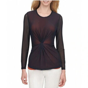 DKNY Top with Twist Front and mesh overlay in Navy/Russet, Size small.