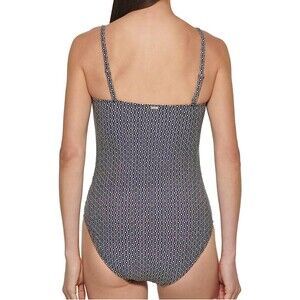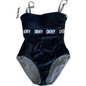 NWT DKNY one-piece swimsuit in sleek black and white with removable straps for versatile styling. Features a built-in bra with soft cups, full lining, and UPF protection. Crafted from quick-drying 4-way stretch fabric for a flattering, comfortable fit that blends modern style with timeless swimwear design.