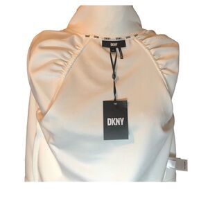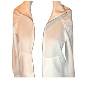 DKNY lovely and stylish white jacket, can wear with jogging pants, sweat pants. Jeans, or even with a dress. Stretchy soft material, zipping from top to bottom. The gather on shoulders gives it a beautiful and unique look.