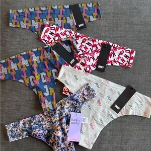Brighten up your wardrobe with this set of 4 DKNY thongs and one Hanky Panky thong. Featuring vibrant colors and playful patterns, these accessories are perfect for adding a fun touch to any outfit. All are size XL. Hanky Panky is OSFM.